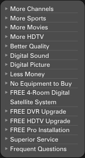 The incredible detail of the sharp, crystal clear picture you will see when you sign-up for Satellite TV is a 100% digital quality signal. Satellite TV offers you better reception on every single channel than Cable. Why? The next time you pass by your local Cable office, look at all the Satellite dishes they use to get the signal that they pump out to you through their cable. When you subscribe to Satellite TV you will get the signal without any "line noise" or "ground distortion". Call us at (866) 795-4195 and disable your cable!!!